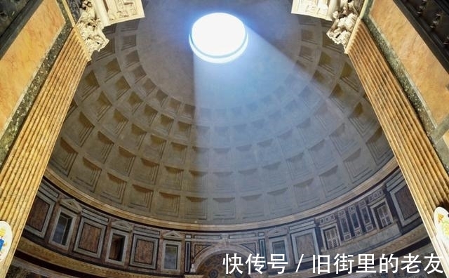 万神殿平面式圆型的,穹顶直径达43.3米,顶端高度也是43.3米。按照当时的观念,穹顶象征天宇。穹顶中央开了一个直径8.9米的园洞,可能寓意着神的世界和人的世界的某种联系。从园洞进来柔和漫射光,照亮空阔的内部,有一种宗教的宁谧气息。