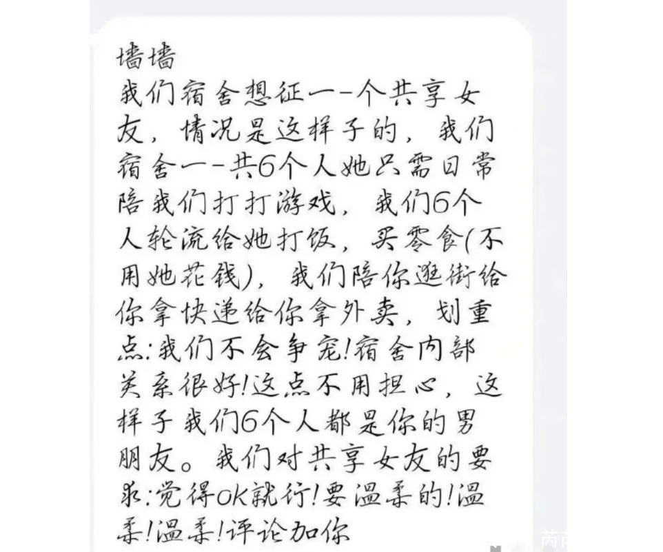 在学校表白墙中征集一名女同学,做共享女友。虽然但是,笔者大为震惊,这真的不会打起来吗?看来理工院校的男同学,真的很渴望恋爱啊。