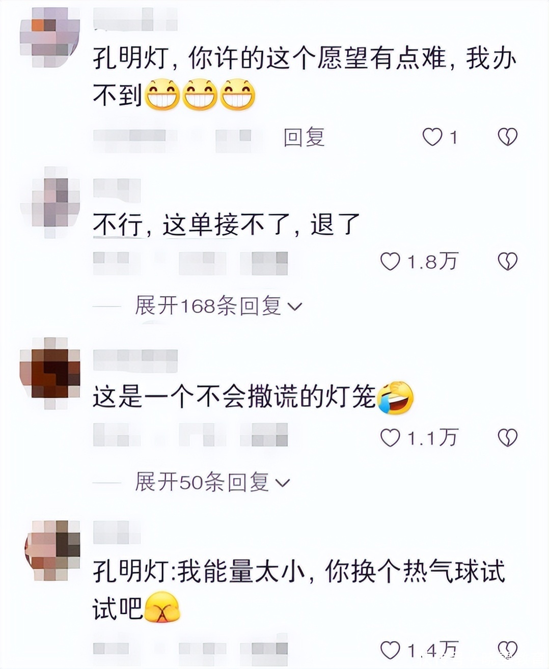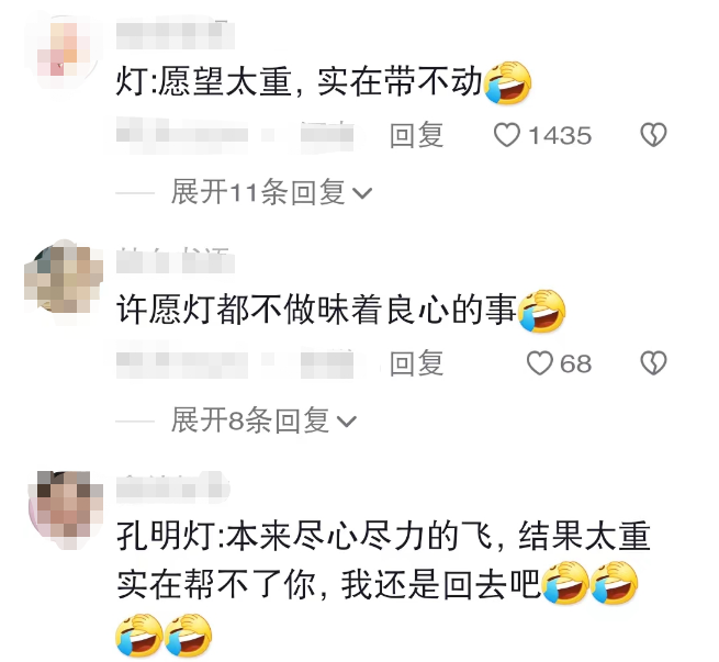 原本是想许愿,却被孔明灯泼了一盆冷水,看上去确实有些好笑,因此网友们也展开了调侃,纷纷站在孔明灯的角度,吐槽孩子的愿望可能太重了,要不换一个能实现的愿望吧!