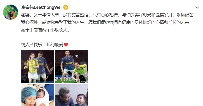 李宗伟自2018年被查出患上癌症之后,至今虽然抗癌成功,但对整个人生的重心发生了巨大改变,他几乎把更多的时间留给了妻子、留给了家人,而近期,李宗泽也示爱妻子,感谢妻子完整了他的整个人生,并且祝愿夫妻两人继续拥有健康的身体和灿烂的心情,一起看着孩子们成长