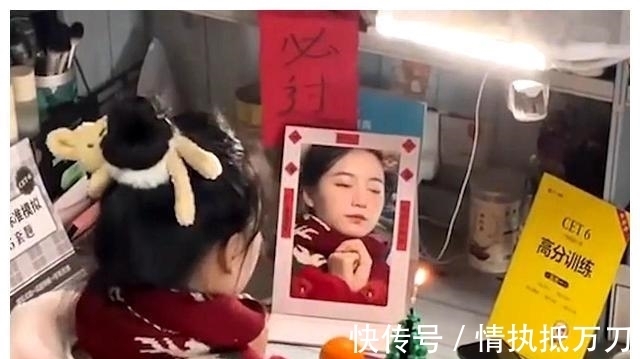 重庆这位同学穿戴整齐,薄施脂粉,还专门放了一面镜子,所以她可能知道这是整蛊蜡烛的,不过表演得如此之好,我还是要为她点赞,并寄上些许安慰:六级不过就不过吧,我从来没过六级,生活还不是要继续。