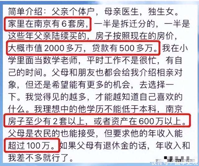 当看到这位女老师的具体要求和相关背景之后,笔者明白了这其中的原因。这位美女的家庭背景可谓是相当优越,父亲是个体户,母亲则是医生,自己则是家里的独生女。更让人羡慕的是自己的家里在南京有6套房子,市值2000万,贷款500万,这样的身家背景想要找到另一半岂不是绰绰有余?