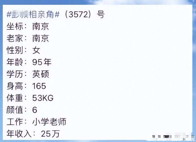 但是看她理想中的男友就明白了一切,要求男生本科以上学历,南京市内有两套房子或者资产在600万以上,可以接受农村父母,但年收入必须100万。如果父母有退休金的话,年收入和她差不多就行。乍看一下,的确是非常门当户对的条件。但是却无法深究,首先农村人肯定是排除了,但是满足这个条件的城里男生也不多。