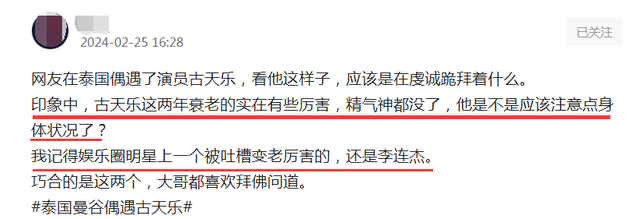 聊完事业情感,唯独剩下健康问题,有网友表示古天乐这些年颜值衰老的厉害,精气神都没有了,应该注意身体状况,同时爆料李连杰之前也喜欢拜佛为身体健康祈福。