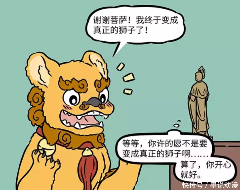 小刘从石头变成了有血有肉的动物,不过外形上跟狮子还是有很大的区别。小刘现在的模样,就是狮子狗,最多有一两分接近醒狮。小刘觉得自己变成了真正的狮子,可是地藏菩萨却告诉它,它的愿望也不是成为真正的狮子。不过小刘这么开心,地藏菩萨也没多说什么。