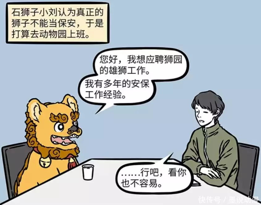 《非人哉》漫画版中,石狮子小刘是小区的保安。因为看了匹诺曹的故事,小刘想要肉身。石狮子小刘找地藏菩萨许愿,让他拥有肉身。地藏菩萨实现它的愿望,让它变成了狮子狗。辞去保安工作之后,小刘去动物园应聘,虽说顺利入职,也进入了狮子群之中,可是小刘却被雄狮一巴掌扇飞。小刘没有放弃,觉得作为狮子,这点事情它能扛过去。