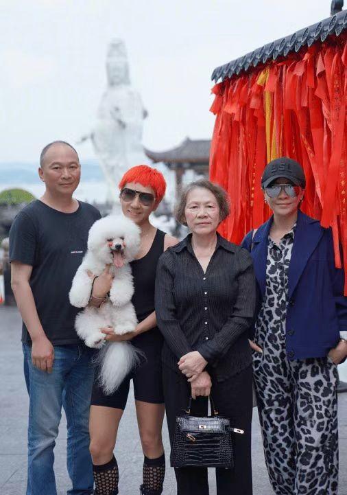 最抢眼的就是刘嘉玲的弟妹,身着黑色背心下搭短裤与渔网高筒袜,摩登打扮很时髦,但是与佛门清净之地似乎有些违和,不像是来虔诚拜佛的更像是来旅行游玩的,而且染红发带着墨镜真的又潮又酷,如果单看整体造型肯定是时尚洋气没话说,但是与背景似乎有些不太搭,换上休闲得体的服装更合适。